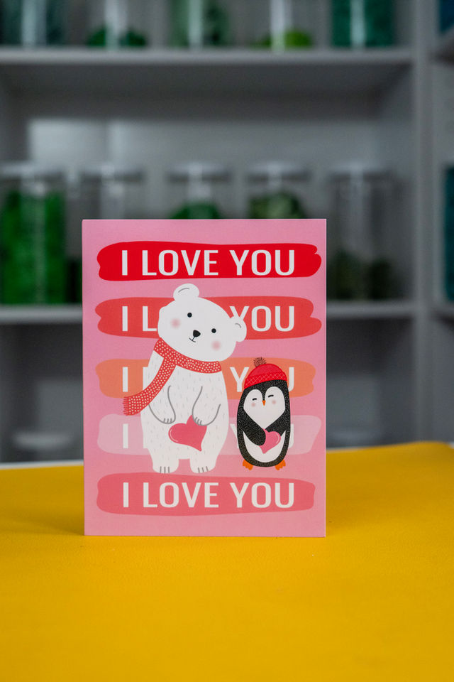 Share a little cozy love with this adorable card featuring a polar bear and penguin bundled up and holding hearts. With layers of “I LOVE YOU” in warm reds and soft pinks, this design is the perfect mix of sweet, cheerful, and heartfelt. Ideal for Valentine’s Day, anniversaries, or simply reminding someone how much they mean to you.